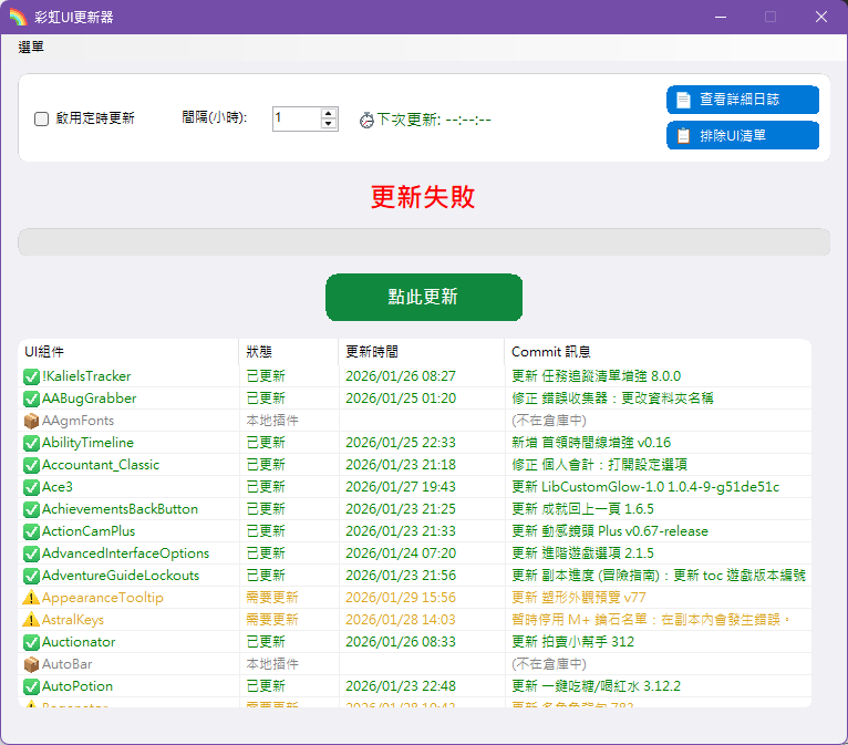 為什麼我點擊"點此更新"都會更新失敗,我有把addons和WTF都先刪除了(圖片裡是我手動把整合包丟進去的)謝謝!