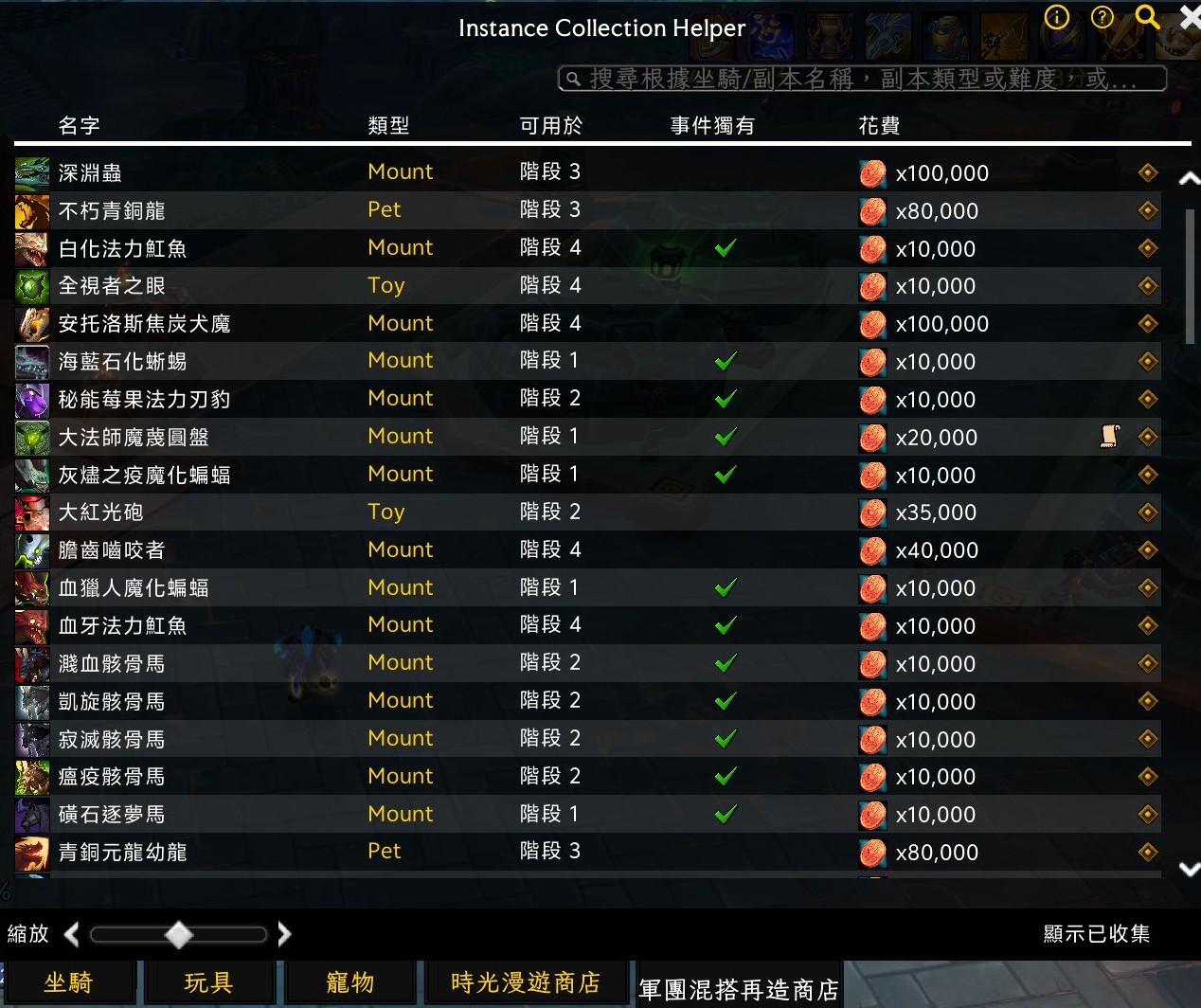 介面截圖為勾選顯示已擁有坐騎(預設不勾只是演示),已擁有顯示為綠色,已刷難度顯示為黑底。