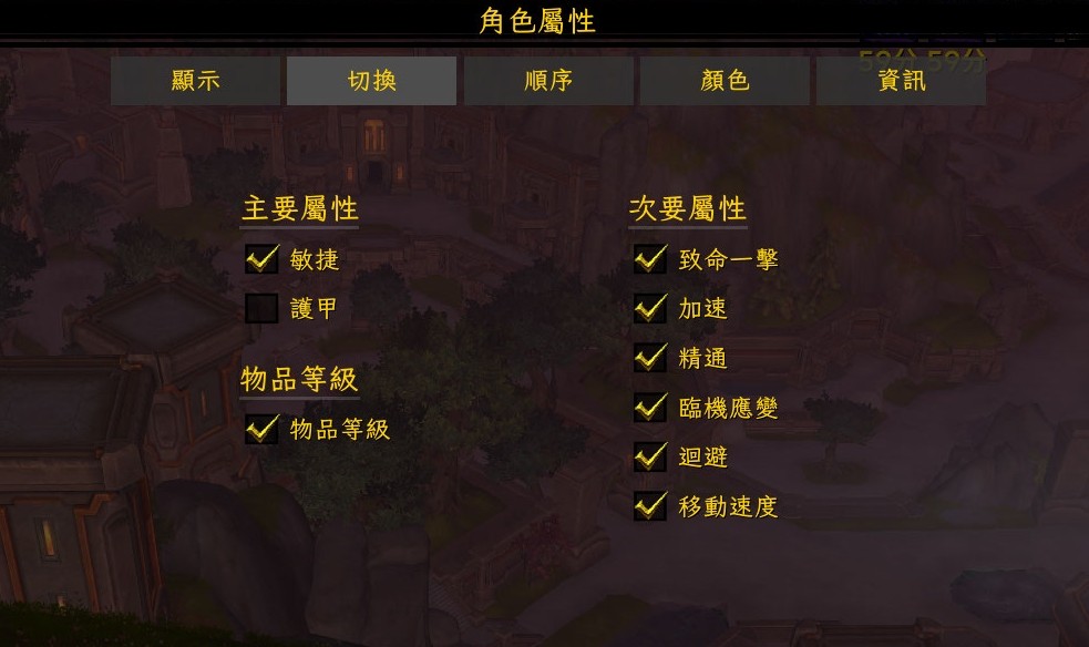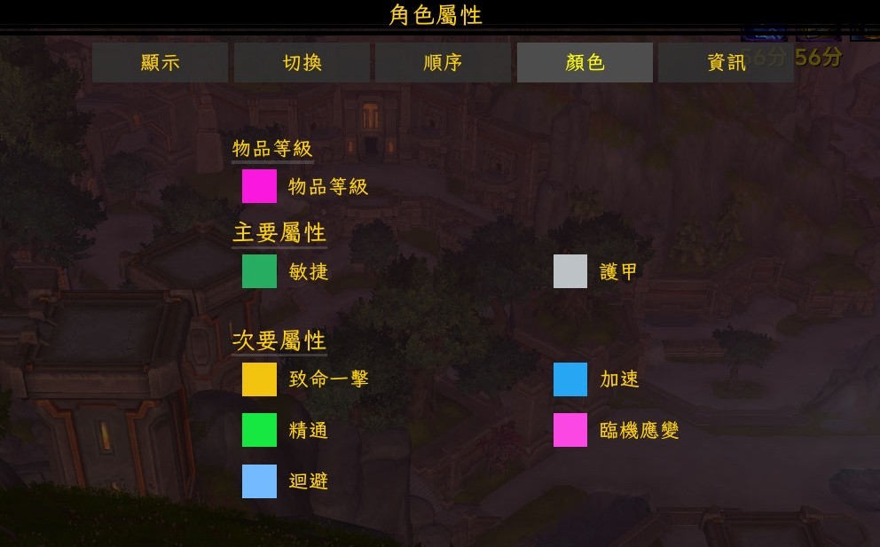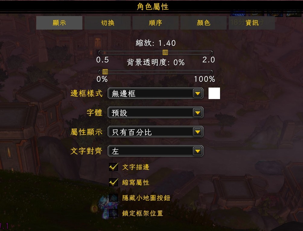 顯示角色的屬性,可顯示百分比或實際數值,或兩者皆有,可自訂顯示的屬性以及順序與顏色等。