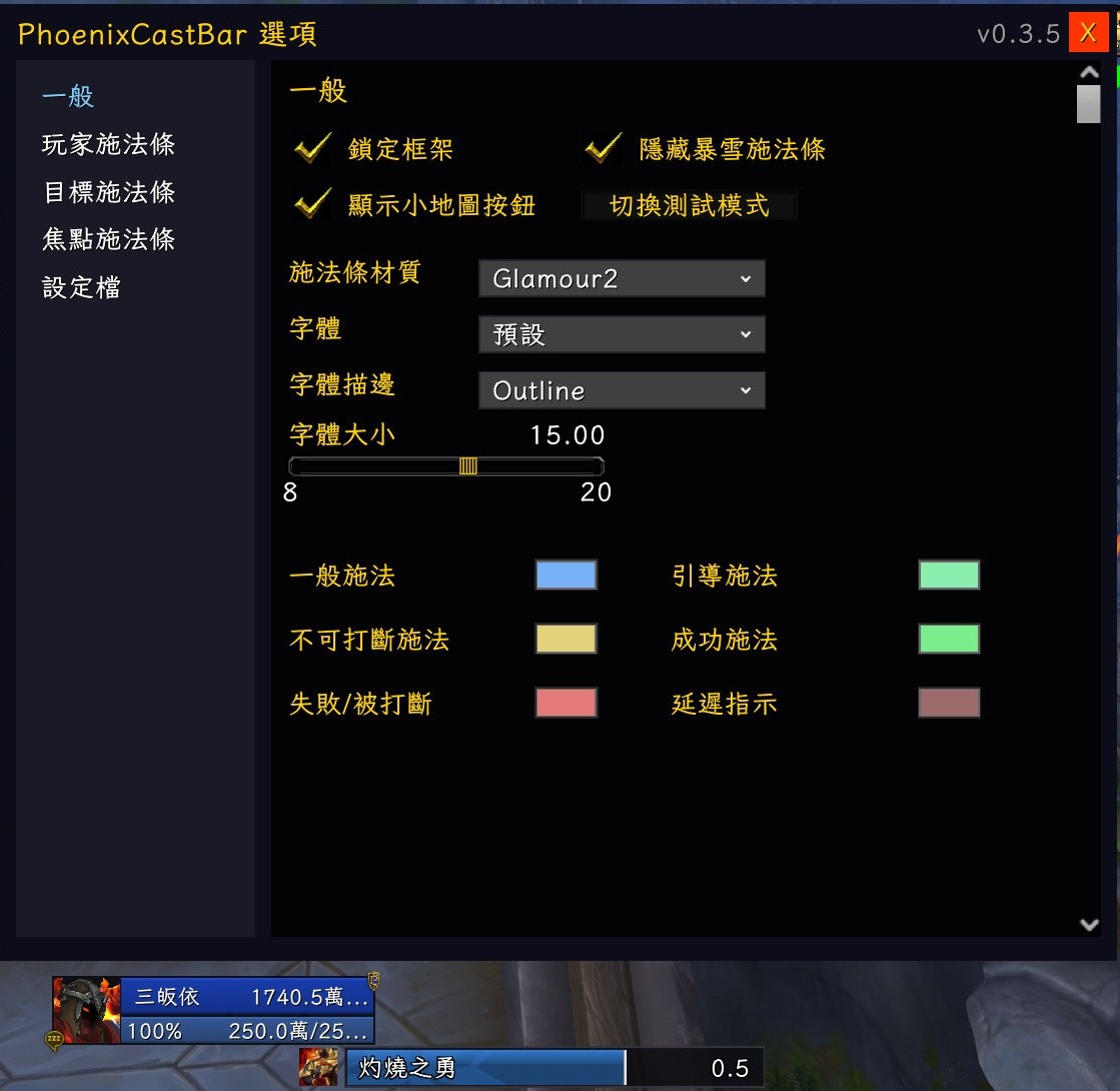插件截圖,上方為選項最下方為施法條。